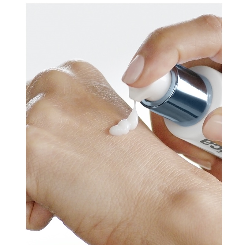 化粧水の後、2~3プッシュを目元を避けて、お顔全体・首になじませます。その後、モイスチャライザーで整えます。1日1~2回ご使用いただけます。